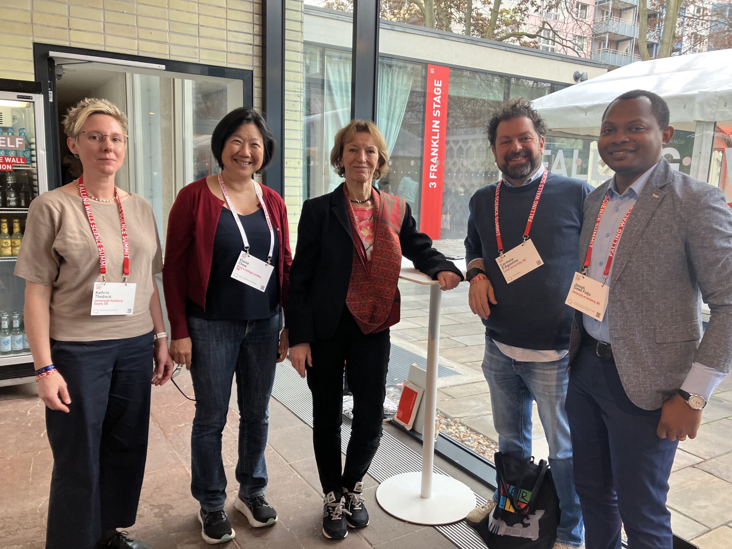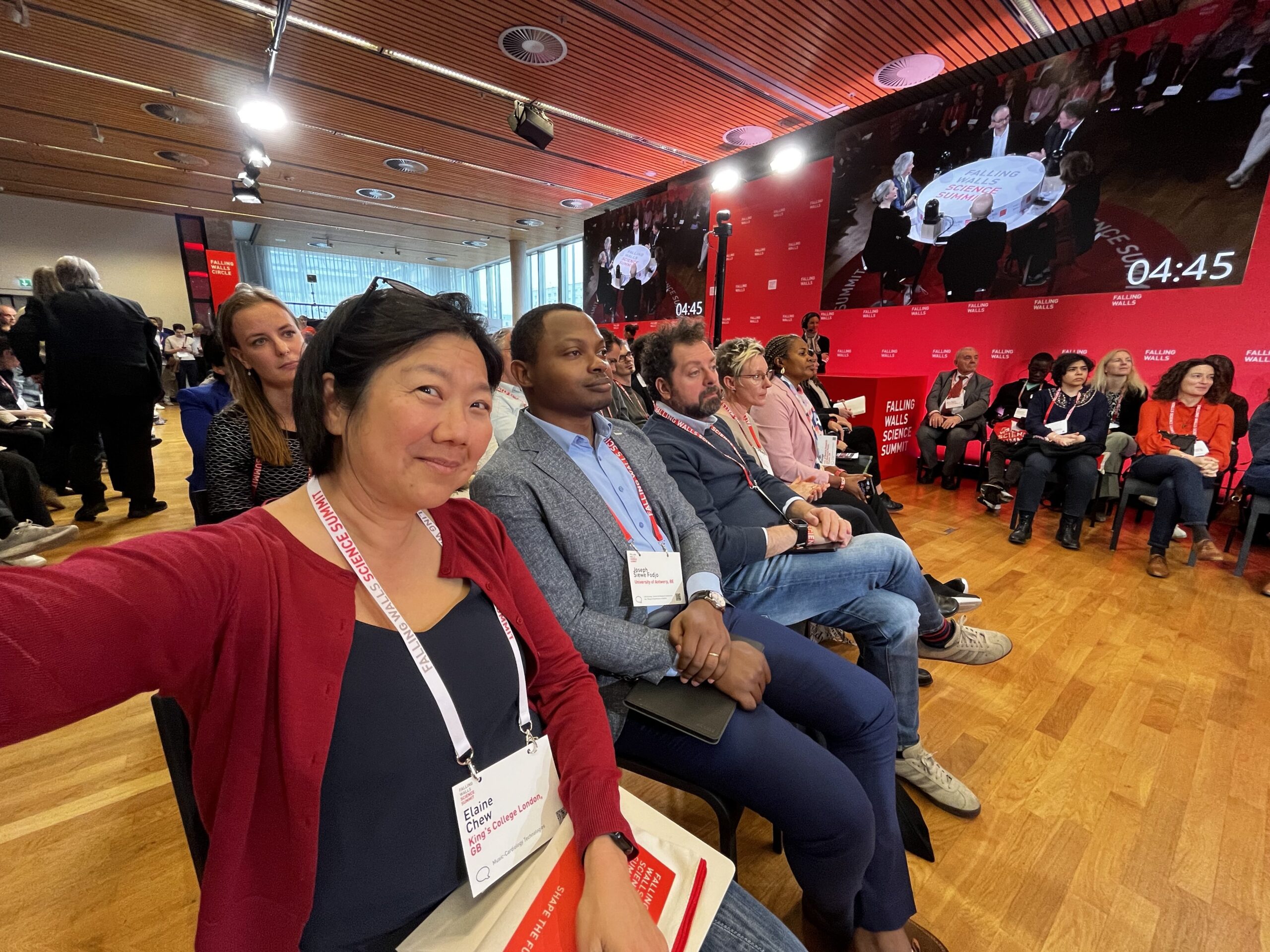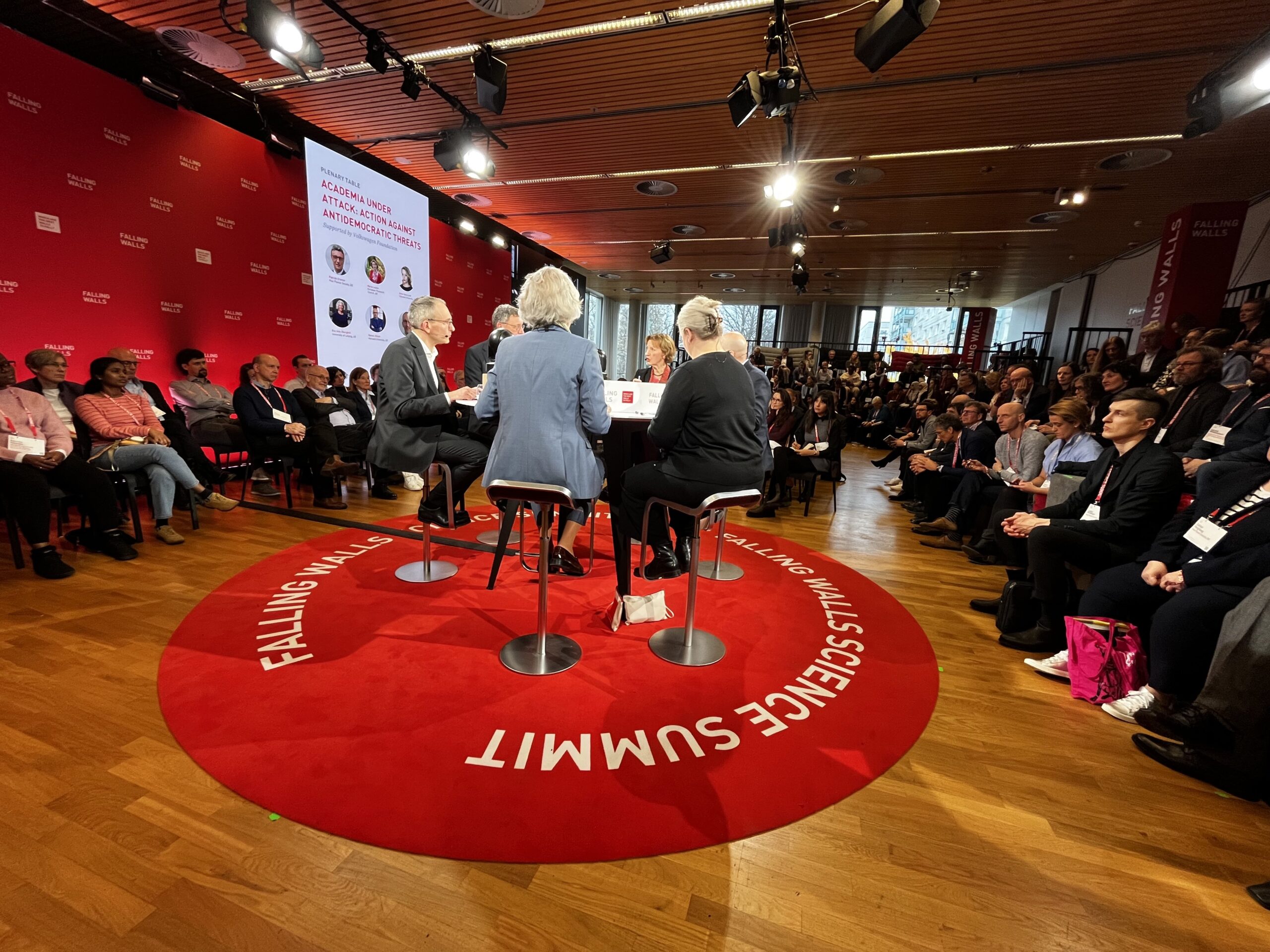 The European Research Council was well represented at Falling Walls, with several Presidents, present and past, attending the summit. Elaine gathered with other ERC grantees Kathrin Thedieck, Carmelo D’Agostino, Joseph Nelson Siewe Fodjo to meet current ERC President Maria Leptin just before the session on “Academia Under Attack: Action Against Antidemocratic Threats“. See the full FW programme.