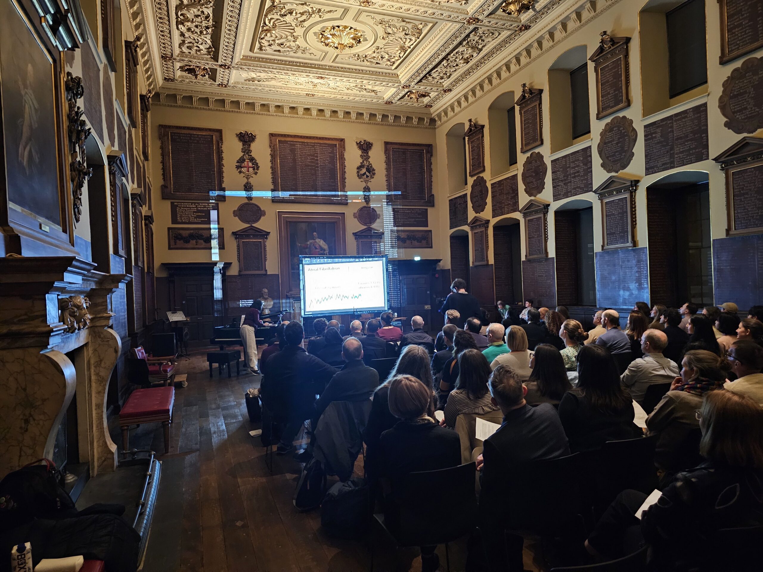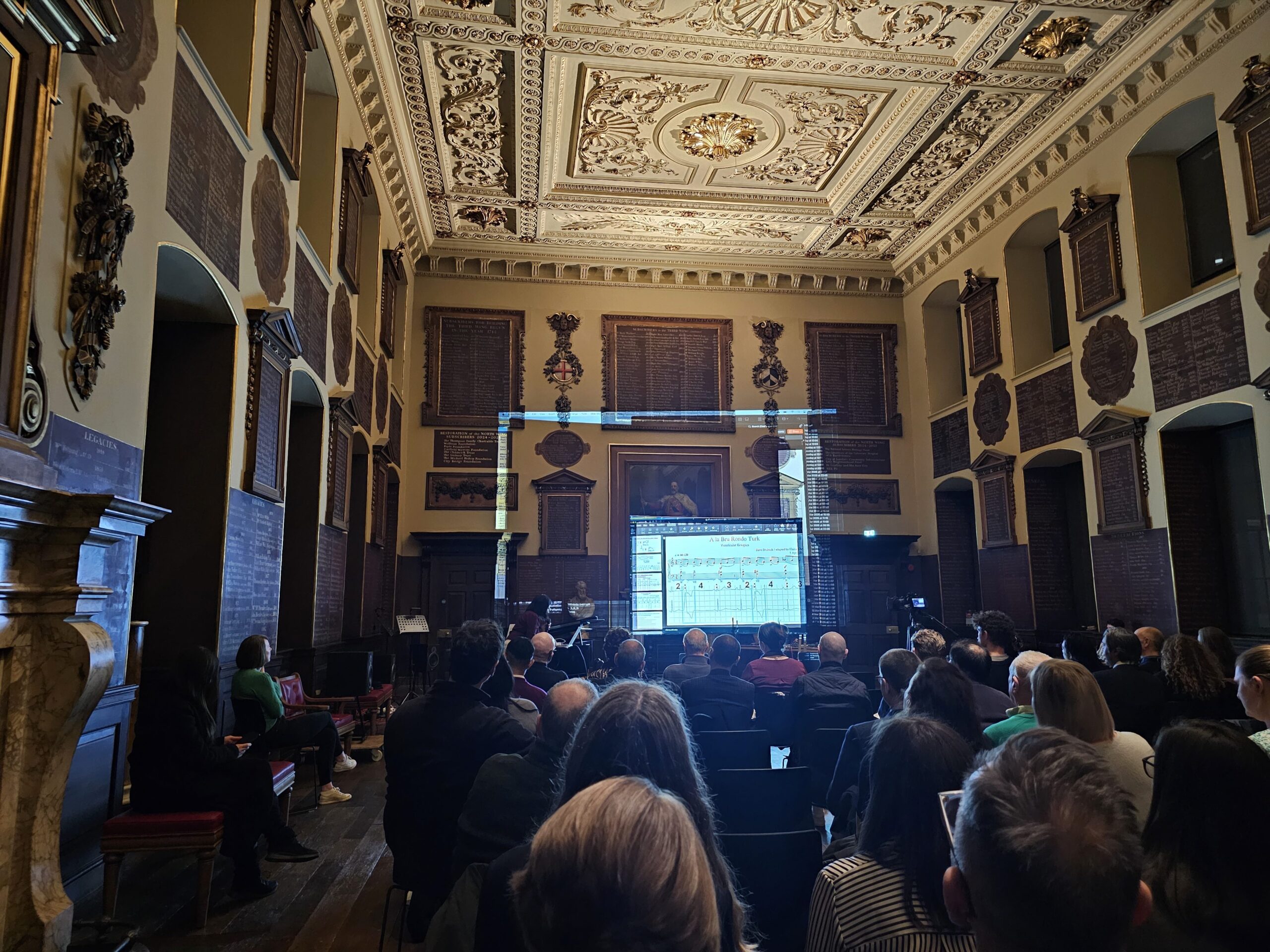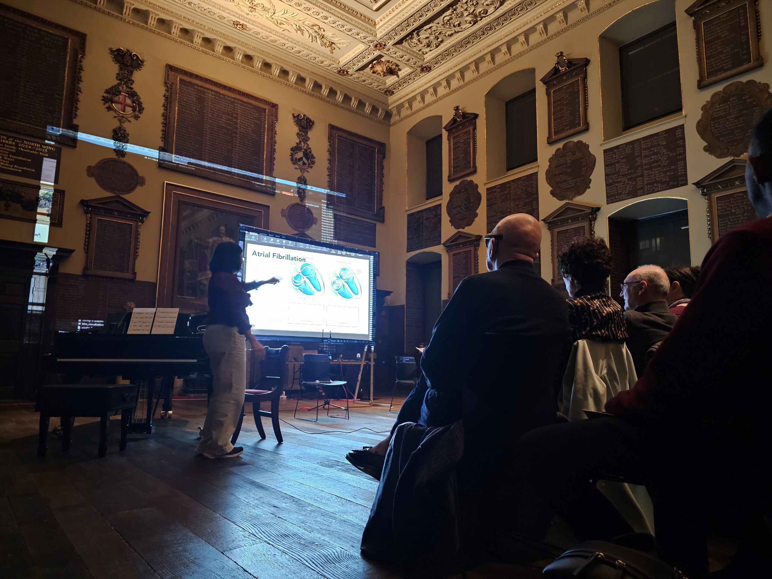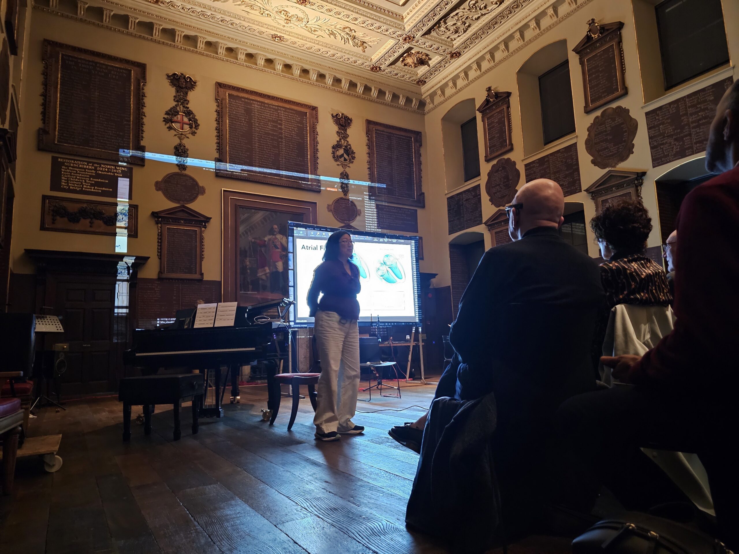 Elaine Chew presents her arrhythmia music and Emma Frid’s heartbeat sonification at the Performance: Key Changes, Medicine, Music, and Transformation which featured sounds and images of disease and healing at the Great Hall of St Bartholomew’s Hospital on Tuesday, 17 March. Transformation was the closing event of Muse Meets Medicine, a two-day festival of arts and the human dimension in healthcare.